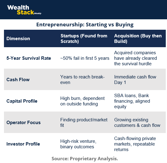 For investors, the implications are even bigger. Backing acquisition entrepreneurs means exposure to durable, cash-flowing assets purchased at valuations far below those in venture capital or large private equity. With more operators pursuing acquisitions — and more infrastructure supporting them — small business ownership is becoming investable at scale.