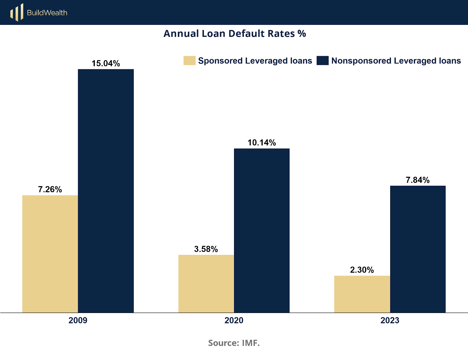 Default rates in private credit remain lower than comparable public instruments, particularly among sponsor-backed transactions. Private equity sponsors often bring operational oversight, faster corrective action, and capital infusions during stress periods. As a result, default rates on sponsored loans have declined below 2.5 percent as of 2023, while non-sponsored loans remain above 7 percent.