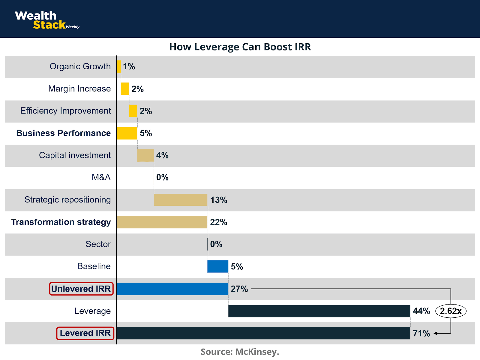 The decomposition of equity returns makes clear that operational improvements—organic growth, margin expansion, efficiency gains, and strategic repositioning—create value at the enterprise level. However, the translation of that enterprise value into equity returns is strongly influenced by capital structure. By funding part of the asset with debt, the same absolute value creation is allocated over a smaller equity base, resulting in a materially higher internal rate of return to equity holders.