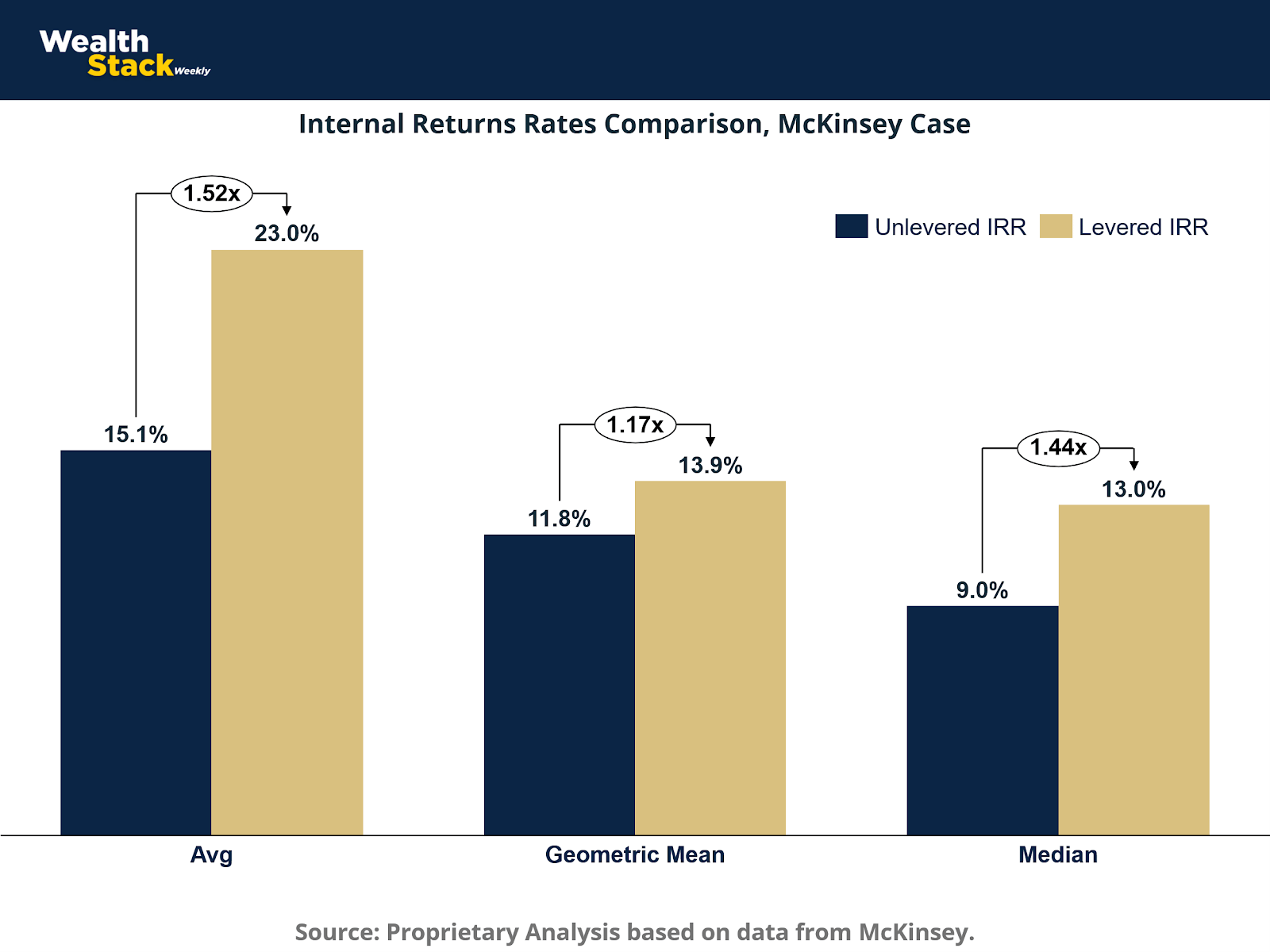 On an arithmetic average basis, unlevered equity returns of 15.1% increase to 23.0% once leverage is applied. This represents a 1.52× multiple on returns, or an incremental 7.9 percentage points attributable to capital structure rather than changes in operating performance. In absolute terms, this uplift alone exceeds the total return of many unlevered investments, highlighting how leverage can dominate outcome dispersion.