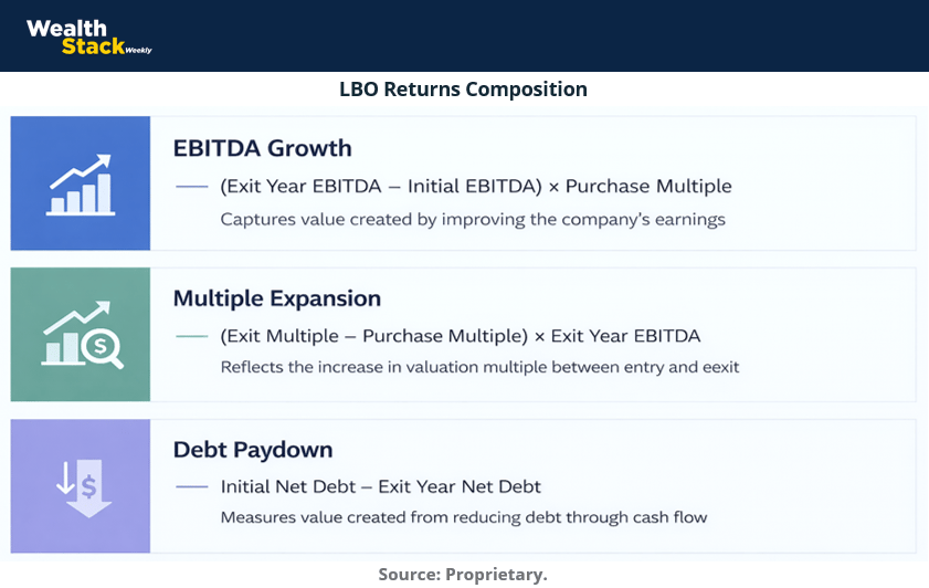 Equity value creation in these structures arises from three sources: improvements in operating earnings, changes in valuation multiples, and debt paydown. The last of these is often underestimated. As net debt declines, equity value increases mechanically, even if enterprise value remains unchanged. Debt therefore functions as a bridge between future cash generation and present ownership.