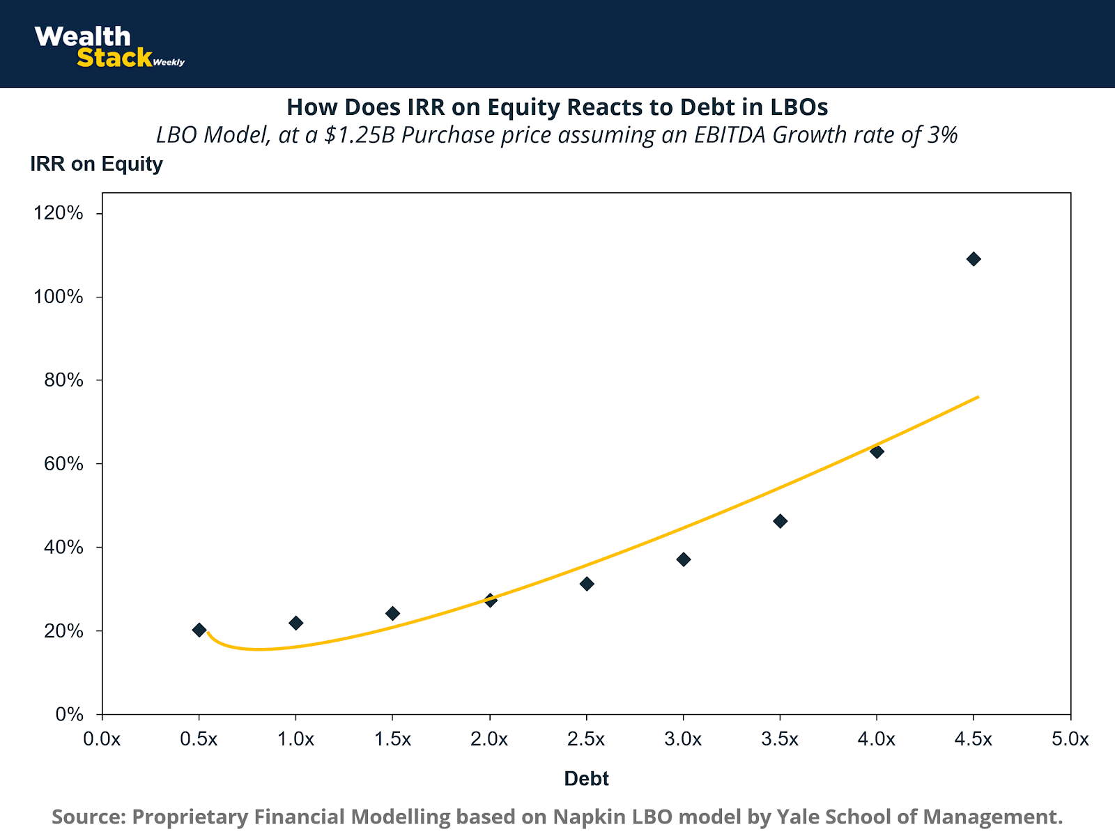 Equity returns respond non-linearly to increases in leverage. As debt levels rise, equity becomes more sensitive to changes in enterprise value and cash flow performance. Initial increases in leverage tend to raise equity IRR, but the relationship is convex: the marginal benefit of additional leverage declines as financial risk increases.