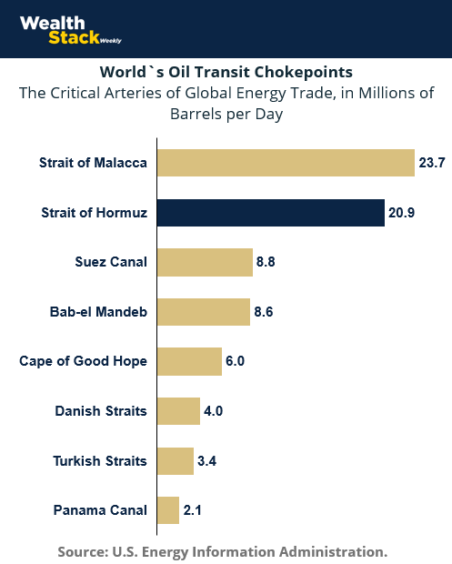 The full journey is even more complicated. The Strait of Malacca connects the Indian Ocean to the Pacific and carries the energy lifeline for China, Japan, and South Korea. The Bab-el Mandeb sits at the southern tip of the Red Sea, in the middle of one of the world's most active conflict zones. The Suez Canal moves oil from the Middle East to Europe through a narrow channel of water cut across the Egyptian desert.