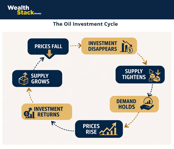 Short-term oil prices move with headlines, geopolitical events, and investor positioning. But the supply of oil moves much more slowly, shaped by geology, capital investment, and infrastructure decisions that take years to play out. When capital leaves the sector, supply tightens over time even if prices fall in the short run. When capital floods back in, the cycle begins again.