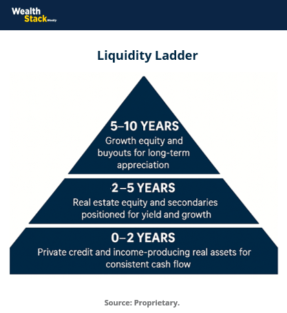 Base (0–2 years): Private credit and income-producing real assets for consistent cash flow.
