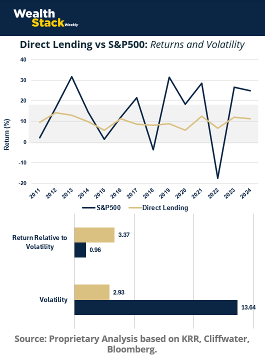 Those returns are broadly comparable to long-term public equity returns. The difference is volatility. Public markets can swing dramatically with double-digit gains followed by sharp drawdowns. Private credit has historically exhibited lower volatility, helping reduce the drag and support steadier compounding.