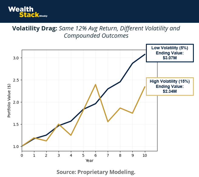 Remember the two-portfolio comparison from earlier?. Same average returns, different volatility. The portfolio with lower variance ended up with +$700k more after a decade on a $1M starting position.