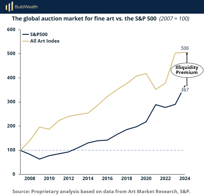 Take the fine art market. No other asset class is associated with both the ultra wealthy AND illiquidity. The global Artprice100® index, a hypothetical model of blue-chip artwork, compounded at roughly 8% annually since 2000, outperforming the S&P 500 during long stretches. Collectors accept the friction of buying and selling—months of negotiations, opaque pricing—because they know they’re being compensated with an illiquidity premium. And the bragging rights ;)