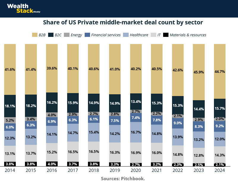 Sectoral resilience: B2B remains the core of the middle market, accounting for roughly 40–45% of activity, providing a stable backbone through cycles.