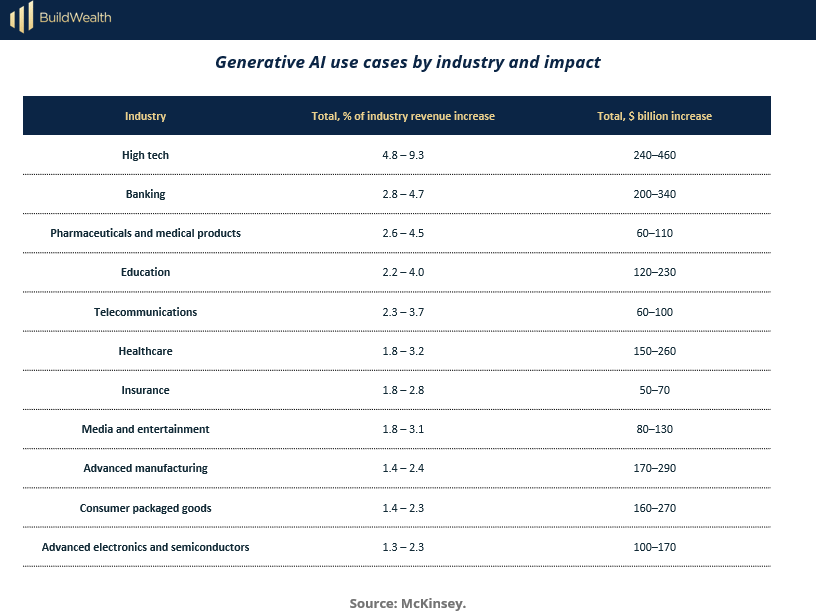 Sector breadth: Generative AI impacts nearly every major industry, with revenue uplifts ranging from ~1.3% to over 9%.