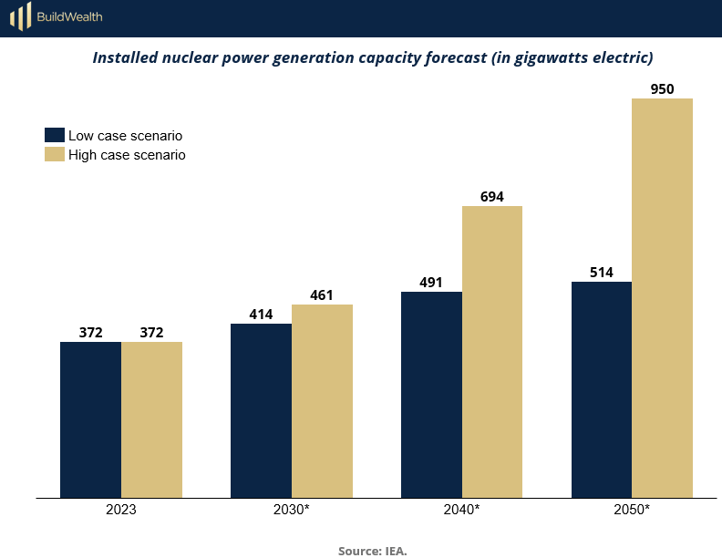 If AI is the new industrial revolution, then nuclear power may be the steel and concrete foundation upon which it rests. The chart projects installed nuclear capacity under both low and high growth scenarios, with capacity potentially more than doubling by 2050.