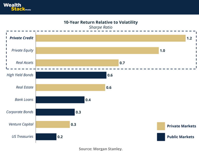 This chart shows Sharpe ratios across major asset categories over the past decade, highlighting that private markets sit at the top of the efficiency spectrum. Private credit, private equity, and real assets significantly outperform all public market categories on a risk-adjusted basis. This reinforces a central truth for portfolio construction: adding private exposure doesn’t just increase potential return—it enhances overall resilience by improving the shape of returns relative to risk. Private markets convert uncertainty into structure, not chaos.