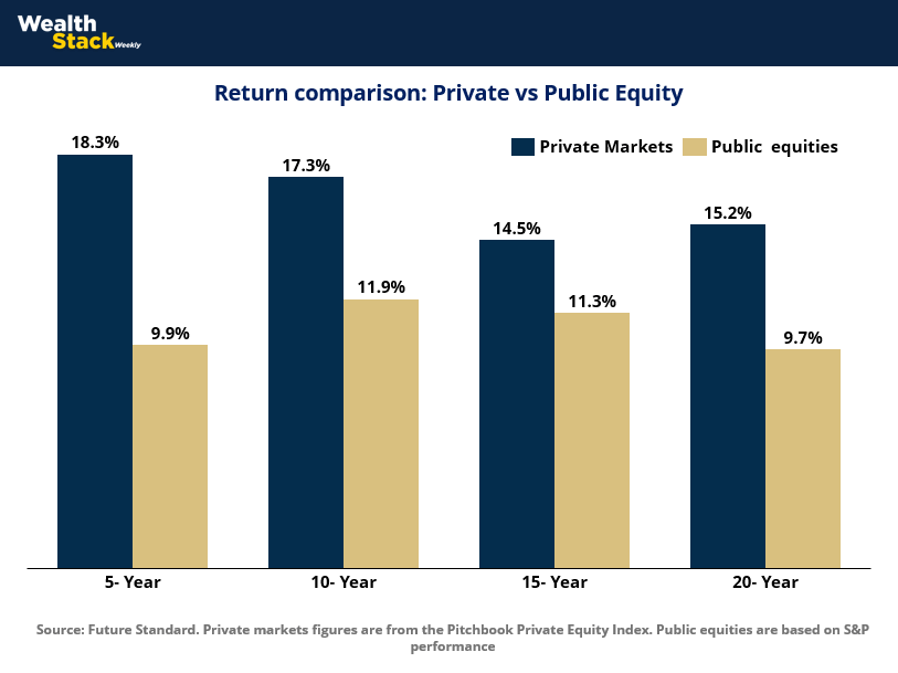Public markets constantly reprice sentiment, momentum, and macro headlines, which interrupts compounding. Private markets, by contrast, allow value creation to occur without daily judgment, enabling returns to grow uninterrupted over long cycles through operational improvement, scaling, and strategic exits.