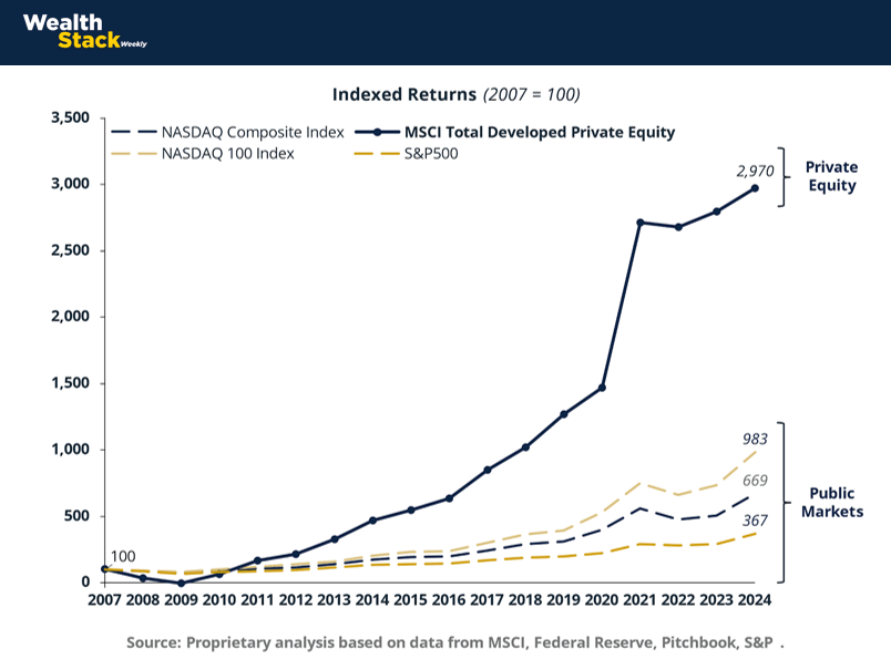 Private equity delivered a nearly 30x multiple on original capital (2,970) since 2007—an order of magnitude beyond public market outcomes.