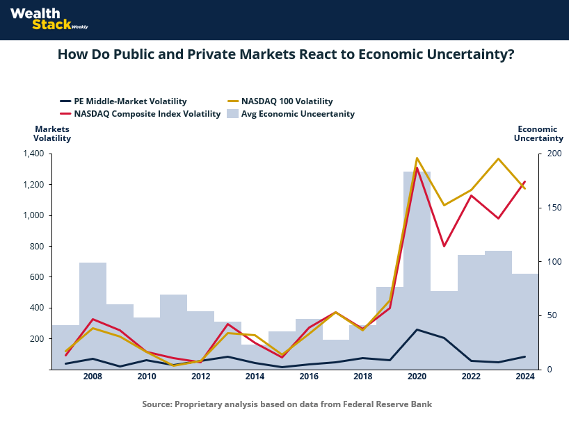 Public market volatility is highly correlated with economic uncertainty, spiking dramatically in periods such as 2008, 2020, and 2022–23.