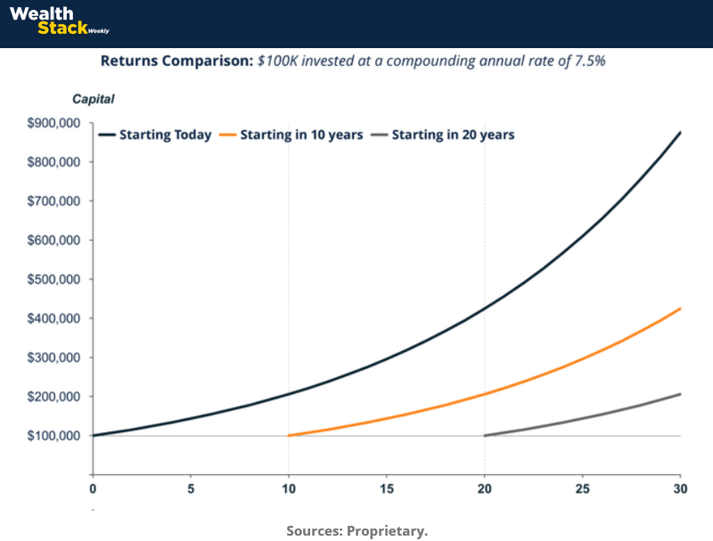 The investor who starts today ends with nearly $900,000 after 30 years from a $100,000 investment—almost 9x growth at a steady 7.5% compounding rate.