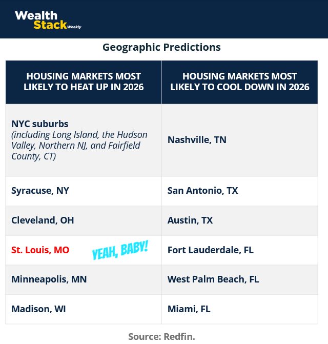 We’ll see some areas cool off in 2026 and others heat up. (Hello to our own St. Louis! Home of the Build Wealth team!)