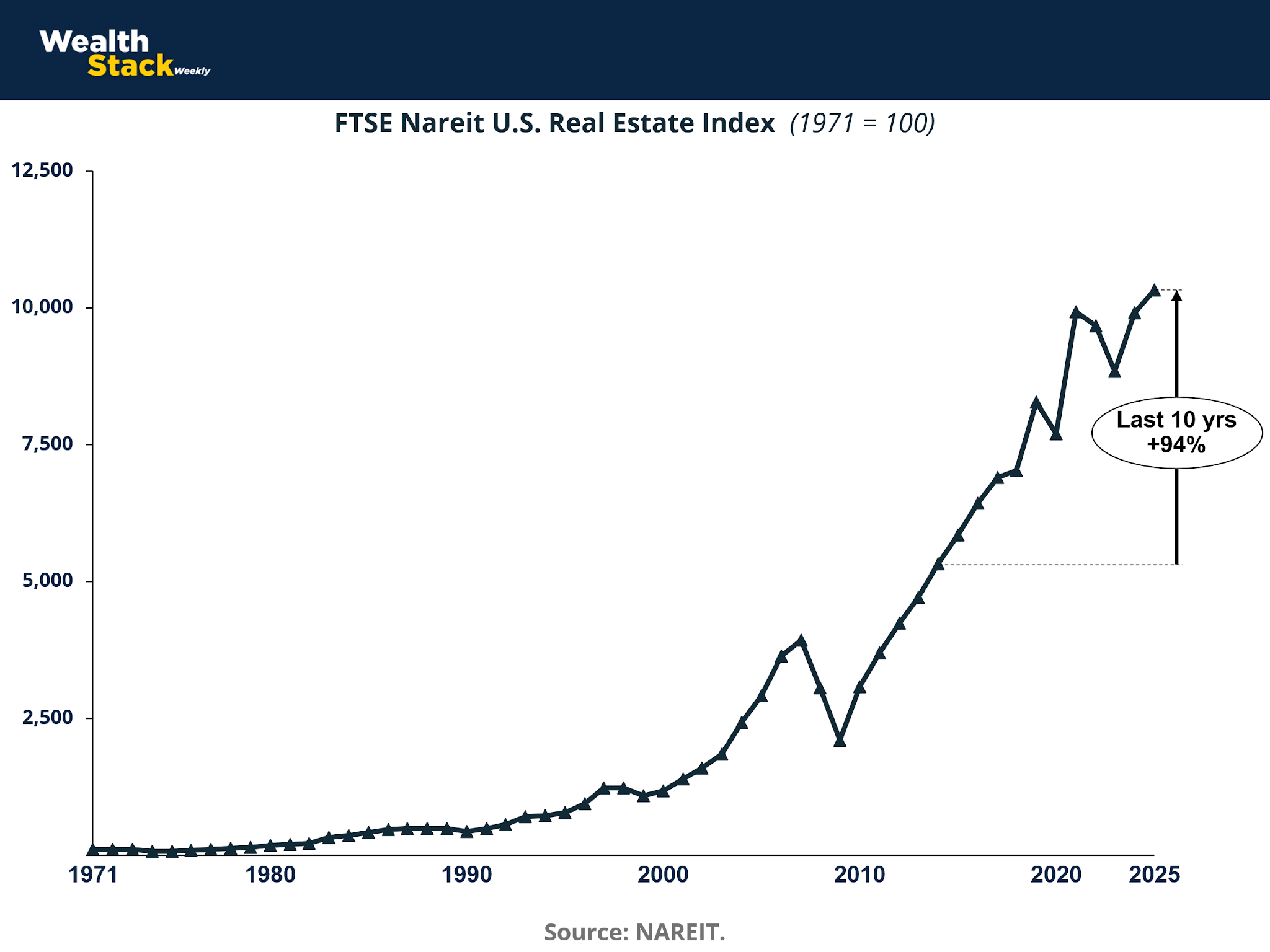 This chart tells that story over more than five decades. The FTSE Nareit U.S. Real Estate Index tracks the performance of publicly traded real estate companies, and the trajectory is unmistakable. Despite periods of volatility, dislocation, and macroeconomic stress, the long-term trend reflects steady, compounding growth tied directly to income-producing assets. The underlying drivers, rental income, asset appreciation, and capital allocation discipline, remain consistent regardless of how the assets are accessed.