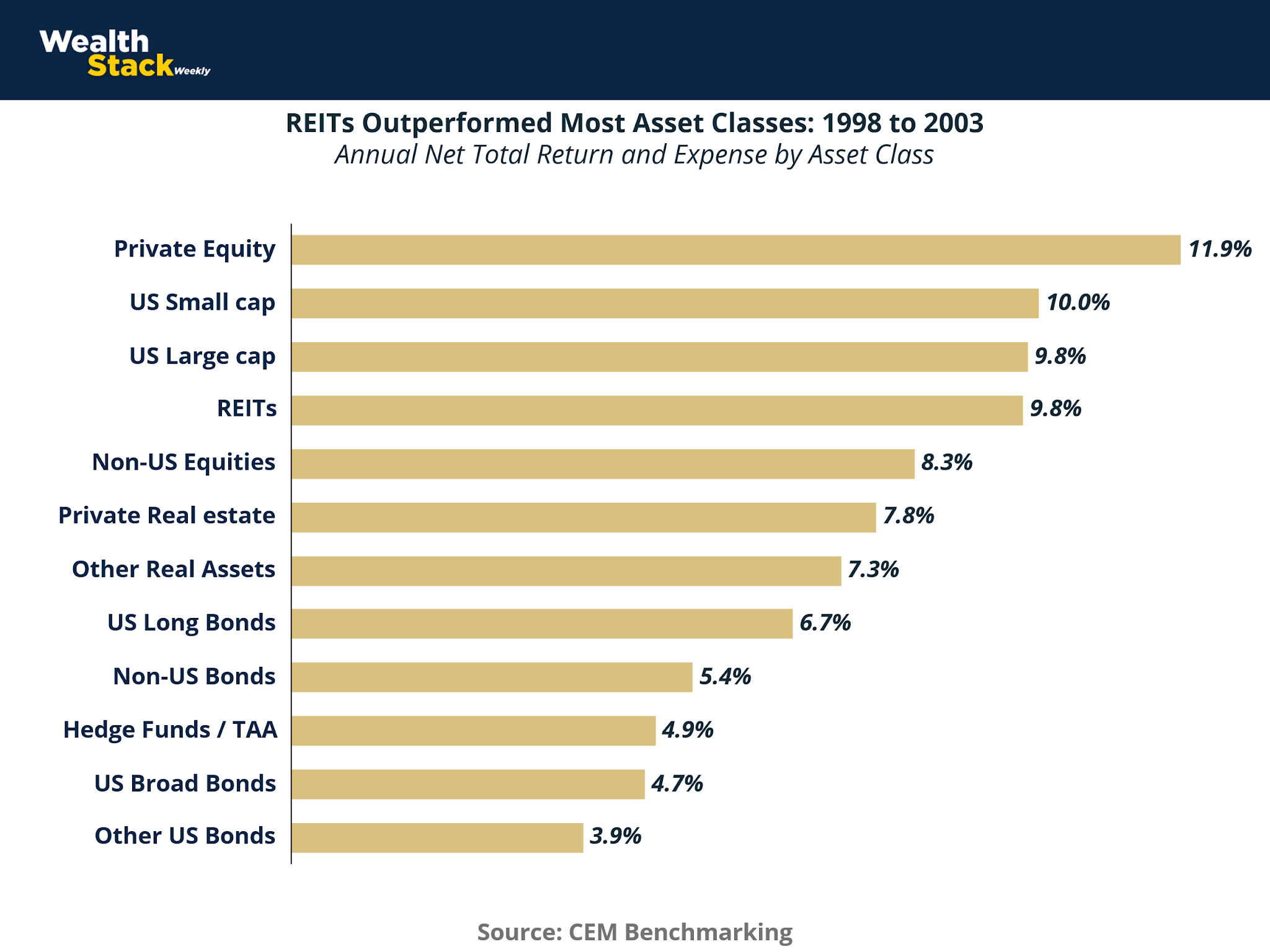 REITs delivered approximately 9.8% annual returns, placing them directly in line with U.S. large-cap equities