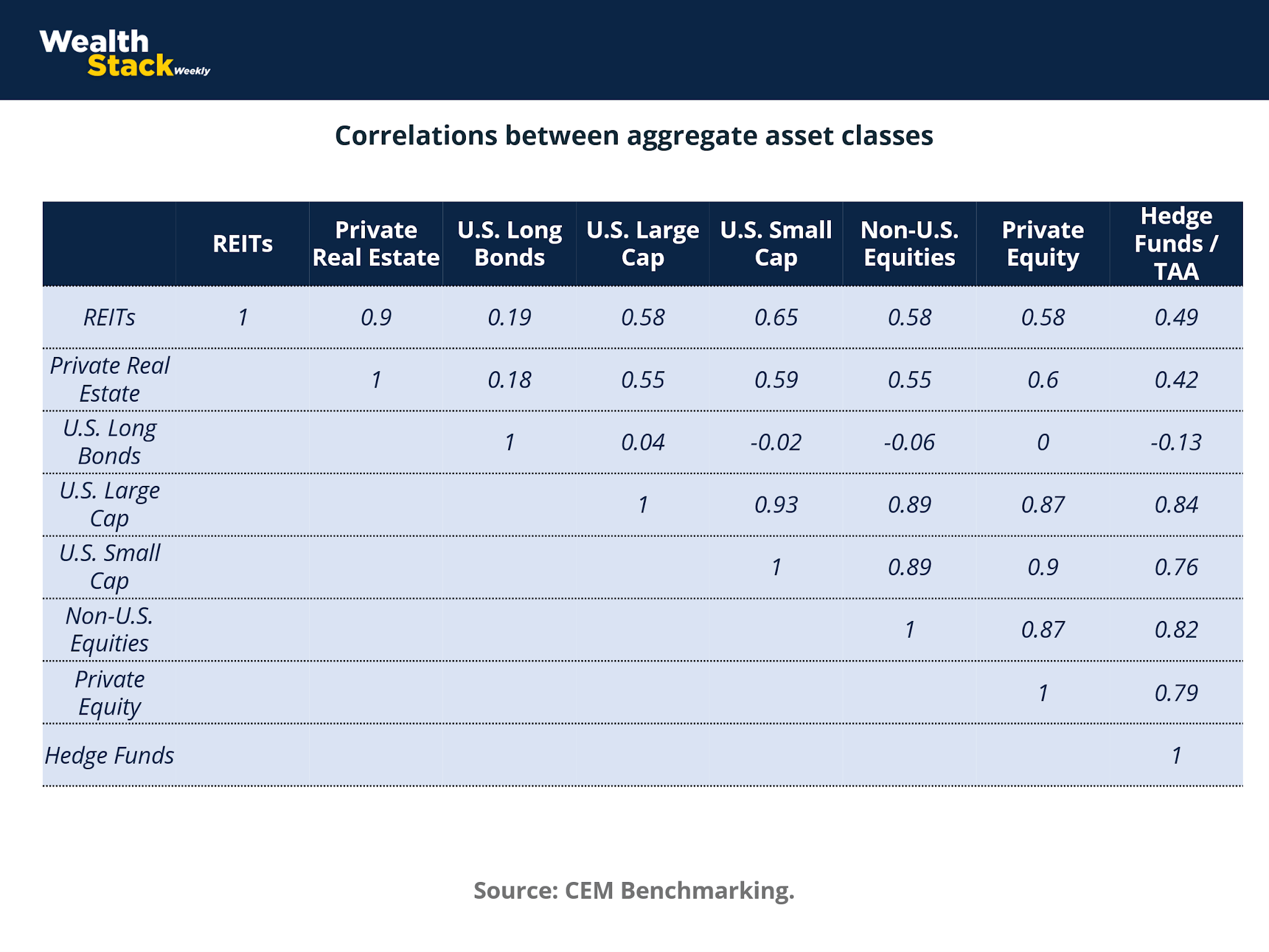 REITs and private real estate show a correlation of approximately 0.9, indicating nearly identical exposure to underlying real estate fundamentals