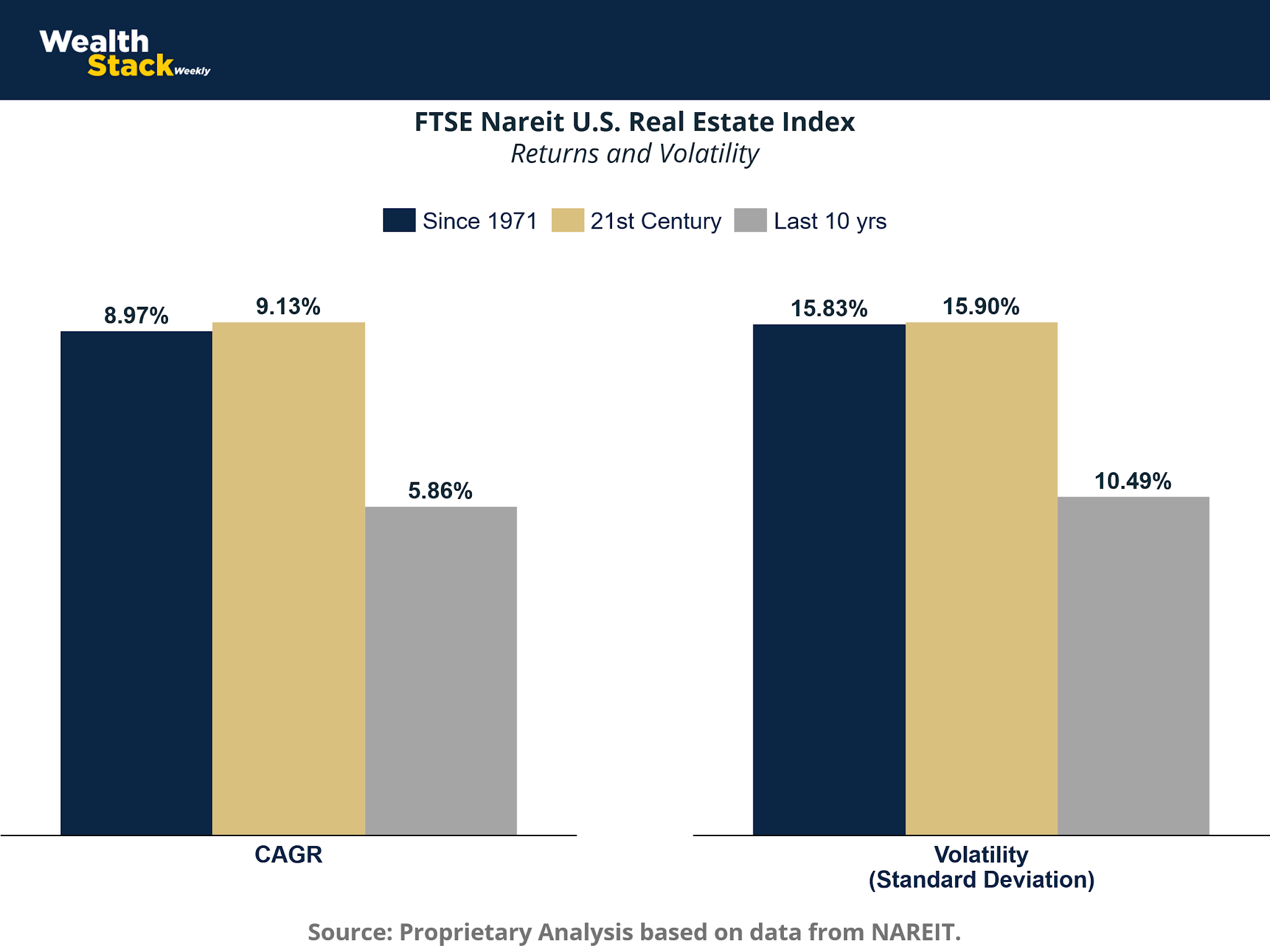 The last 10 years show reduced volatility at 10.49%, indicating periods where public real estate can exhibit both stability and resilience