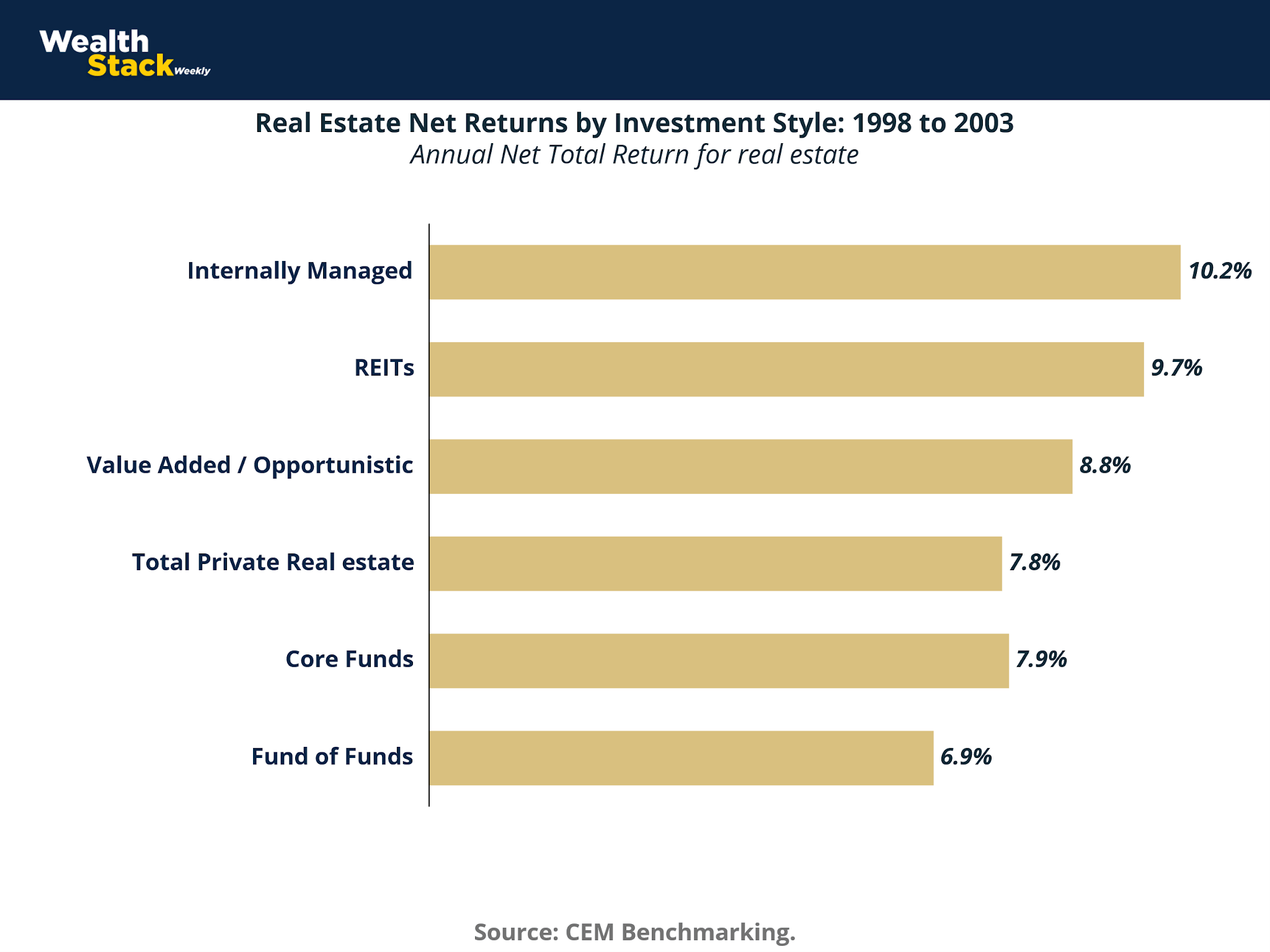 This chart isolates that reality with clarity. While top-tier internally managed real estate portfolios achieve strong performance, the broader universe of private real estate consistently underperforms publicly traded REITs. The gap is not driven by market cycles or timing differences. It reflects structural inefficiencies across the private landscape, including higher fees, fragmented execution, and uneven operator quality.