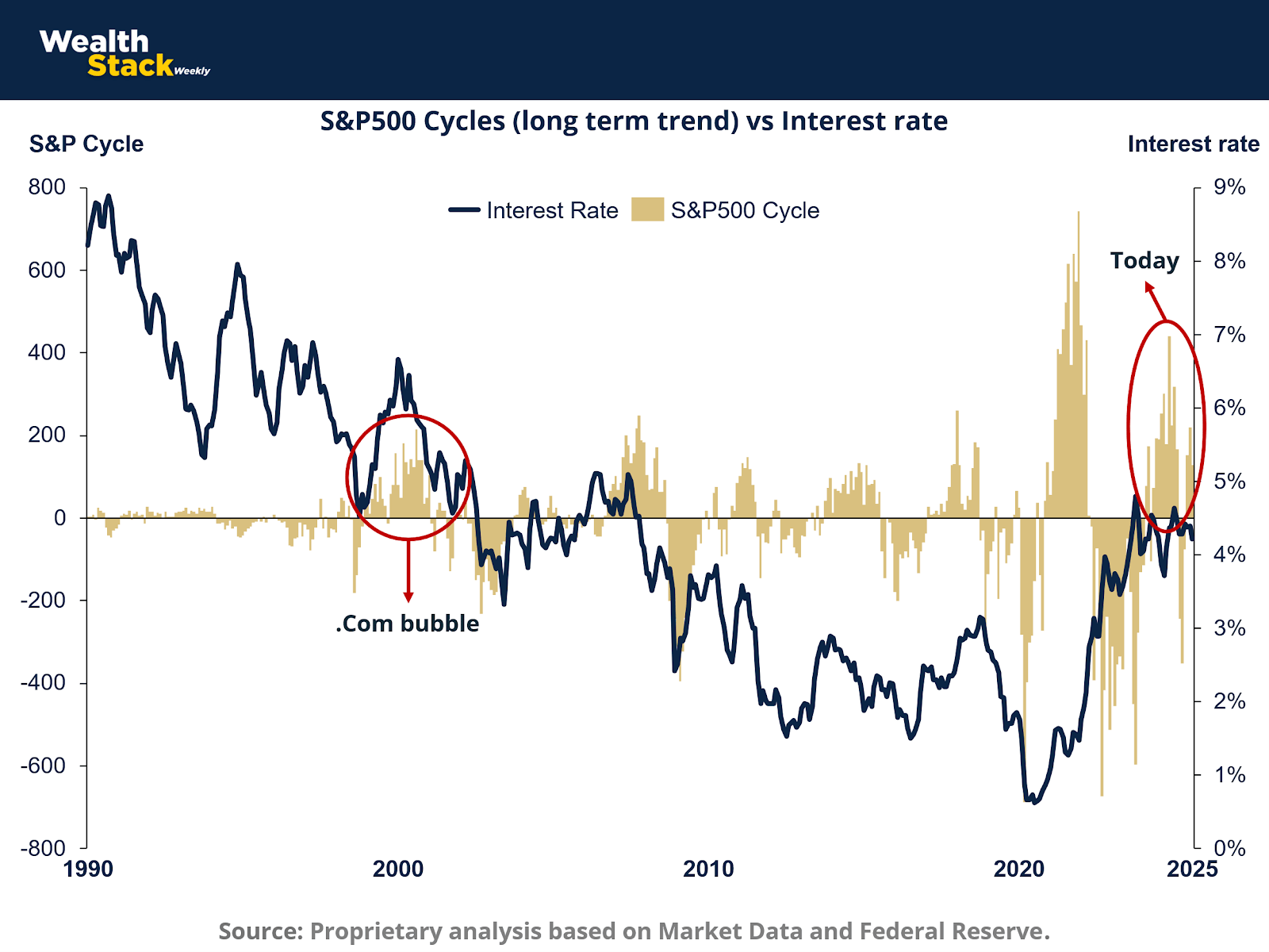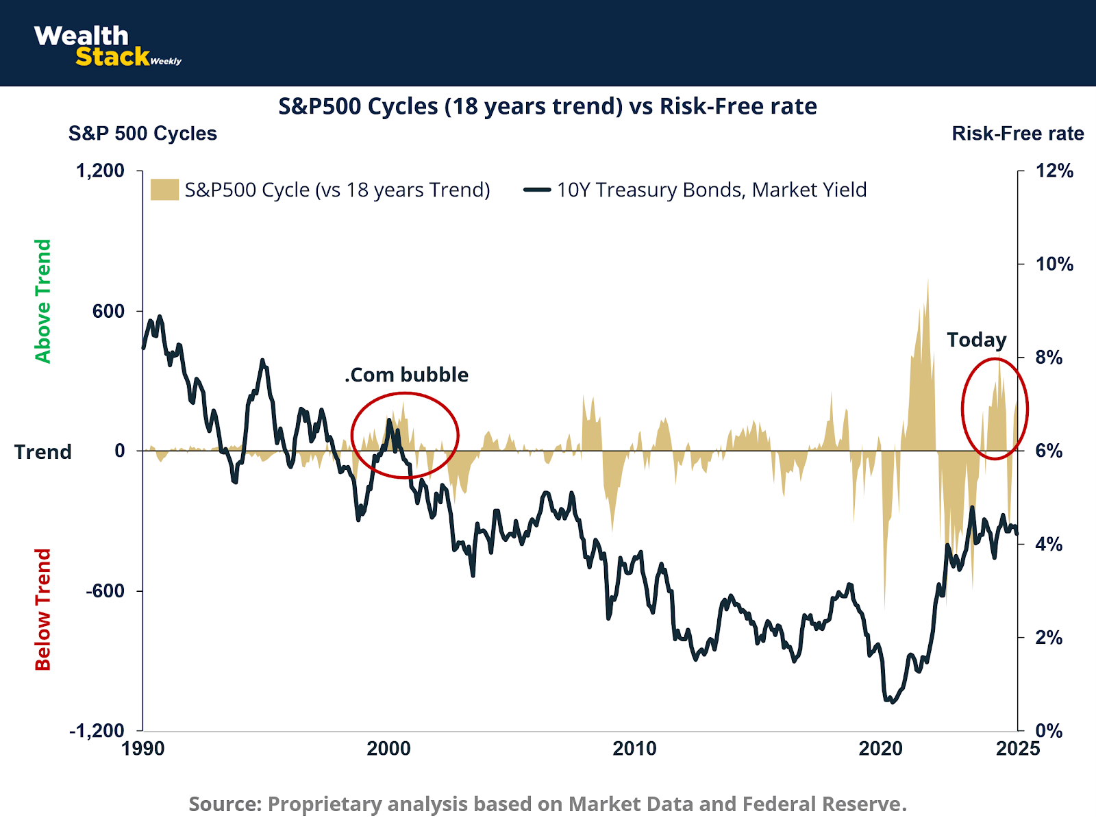 The chart reveals a familiar contradiction. When the risk-free rate offers attractive return per unit of certainty, the justification for speculative equity exposure evaporates. In 2000, the 10-year Treasury yielded 6% while tech stocks priced in 25% earnings growth. In 2025, yields are near 5%, but equity valuations again assume double-digit expansion.