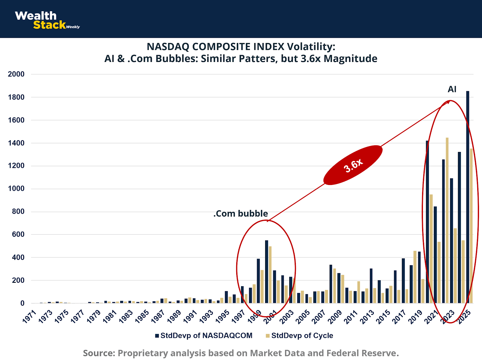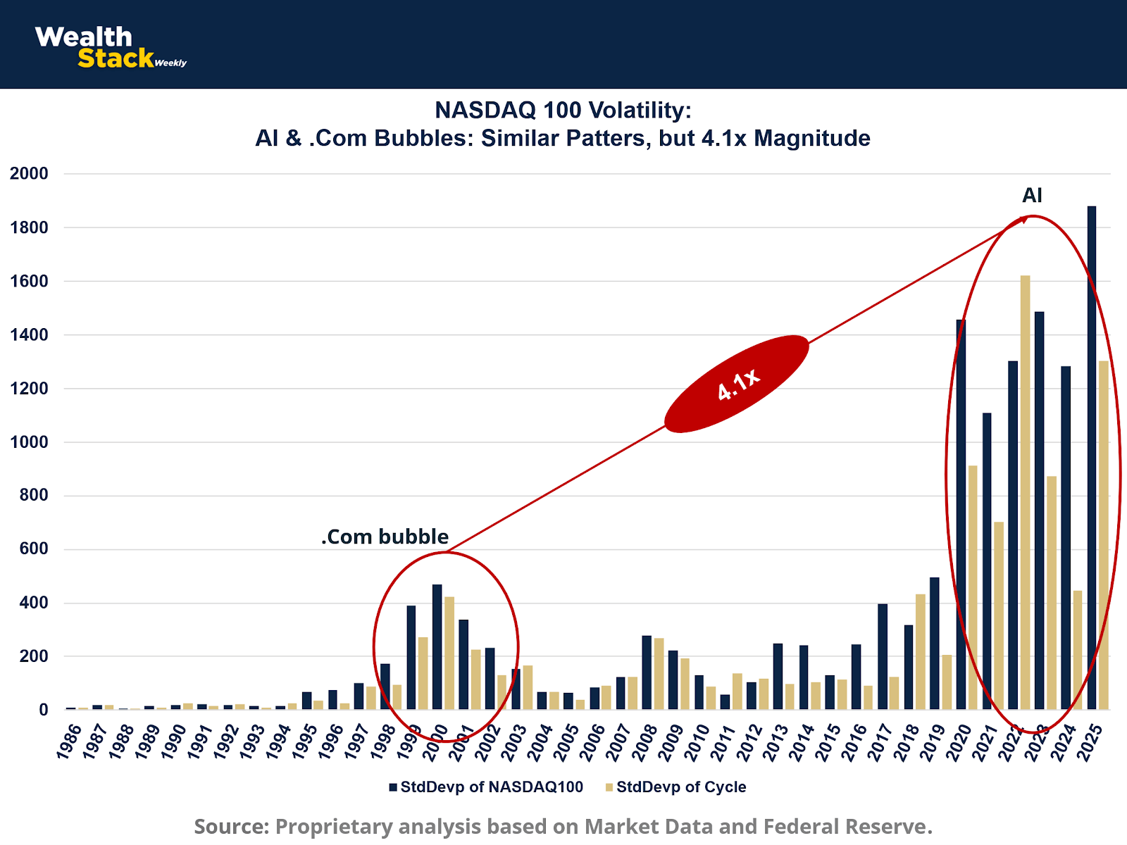 Historical comparisons expose the scale of the distortion. Between 2022 and 2025, the NASDAQ 100’s average annualized standard deviation was 4.16 times higher than in 1999–2002. For the NASDAQ Composite, the multiple was 3.75x. When measured by cyclical deviation (observed value minus long-term trend), both indices still show roughly 4x amplification.