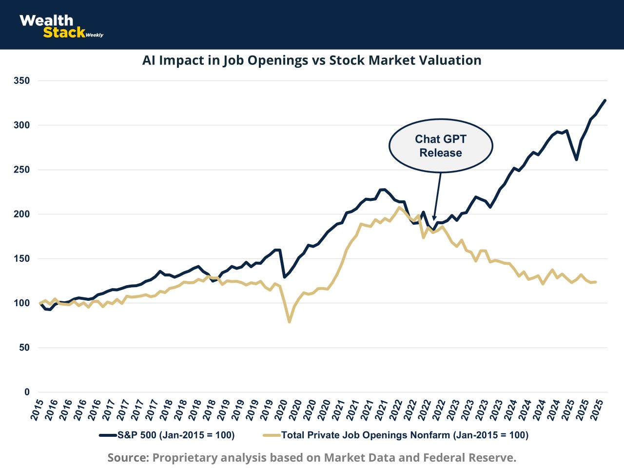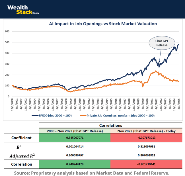 After the release of ChatGPT (November 2022), that relationship inverted. From late 2022 to today, the correlation turned negative (-0.9017), meaning markets are rising even as new job creation declines.