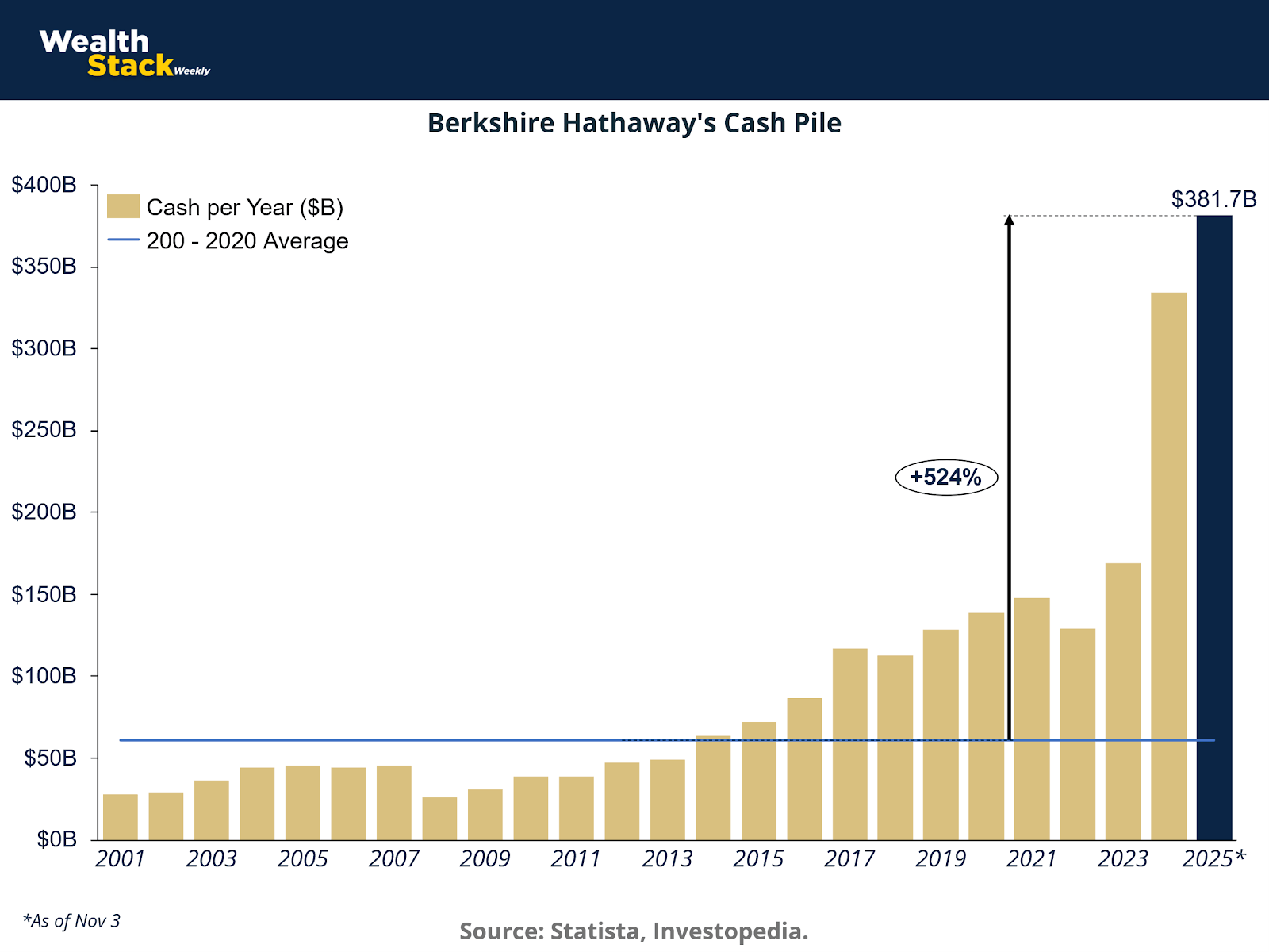 Statista. (2025). Berkshire Hathaway's Cash Pile: An Ominous Sign? https://www.statista.com/chart/34414/cash-holdings-of-berkshire-hathaway/?srsltid=AfmBOoqtNfiQpBibxu6Q5ZFvRCr8hGE8WHHAOOmyNynDUvqFiCYAgWHB