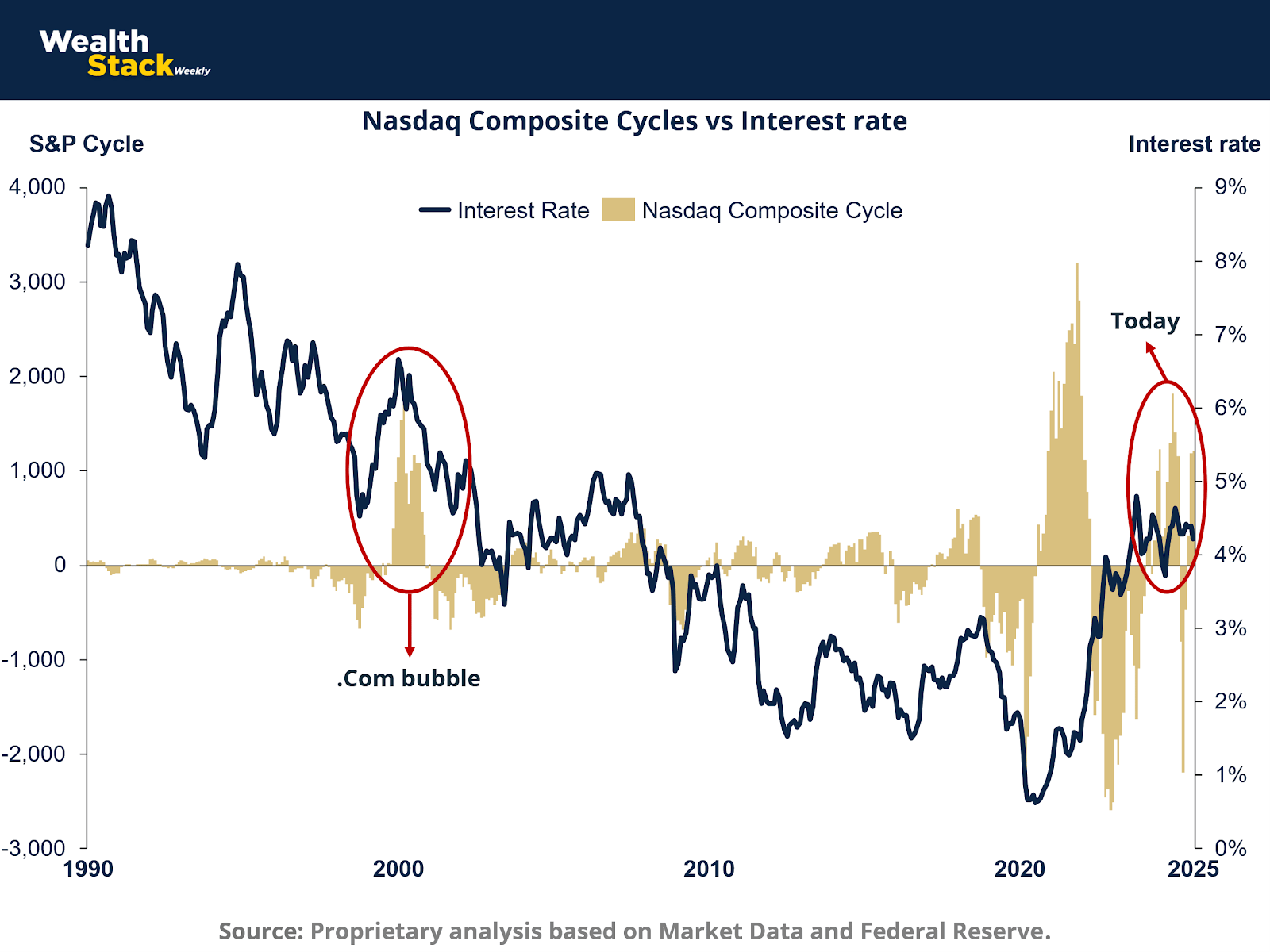 Each spike represents an emotional echo of the early 2000s. Then, it was broadband and e-commerce. Today, it’s artificial intelligence and machine learning. Both stories share the same shape: exponential optimism followed by liquidity compression.
