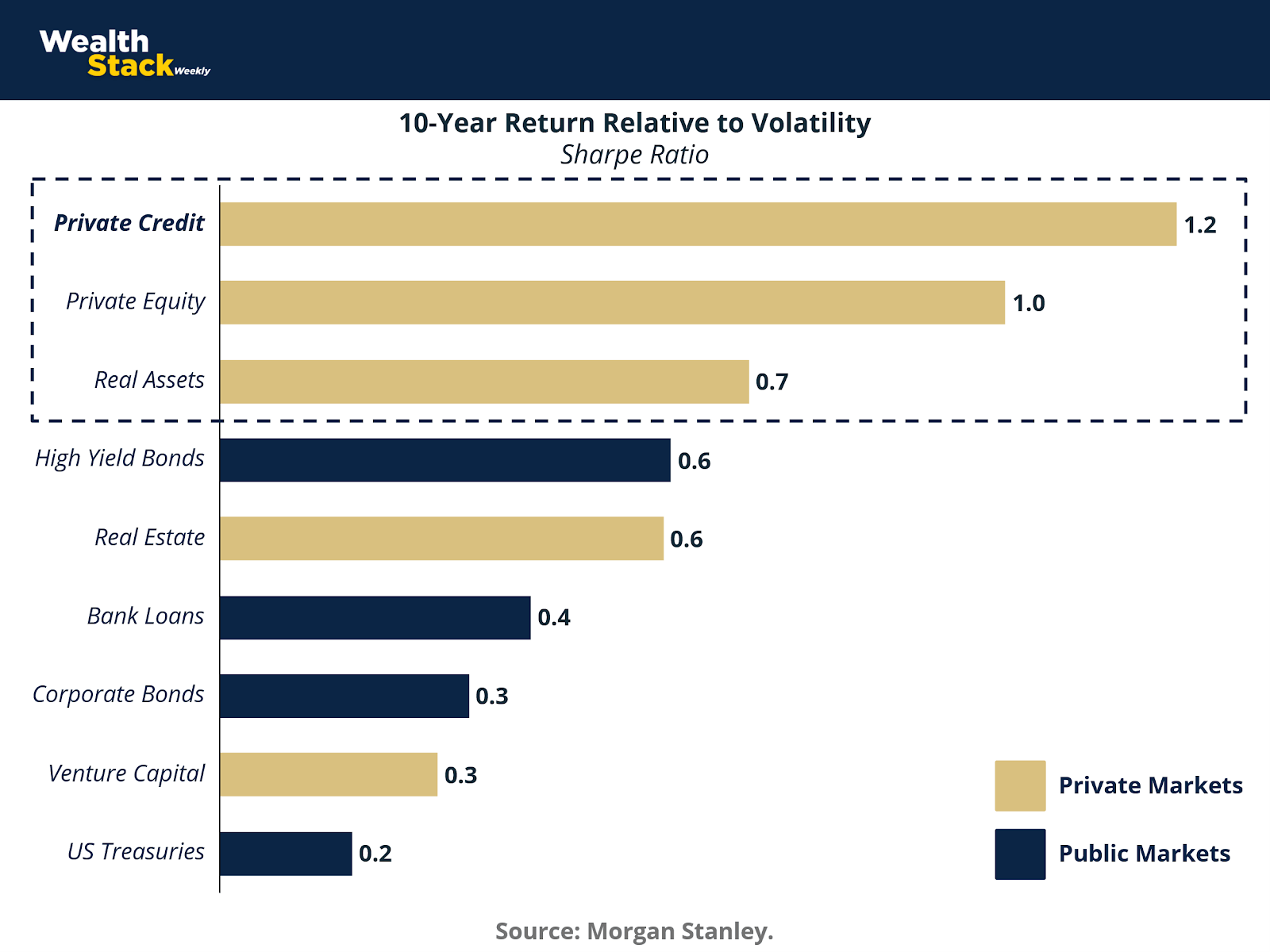 This chart captures the structural advantage of private markets. Over the past decade, alternative investments — especially private equity, private credit, and infrastructure — have delivered higher returns per unit of volatility than public equities.