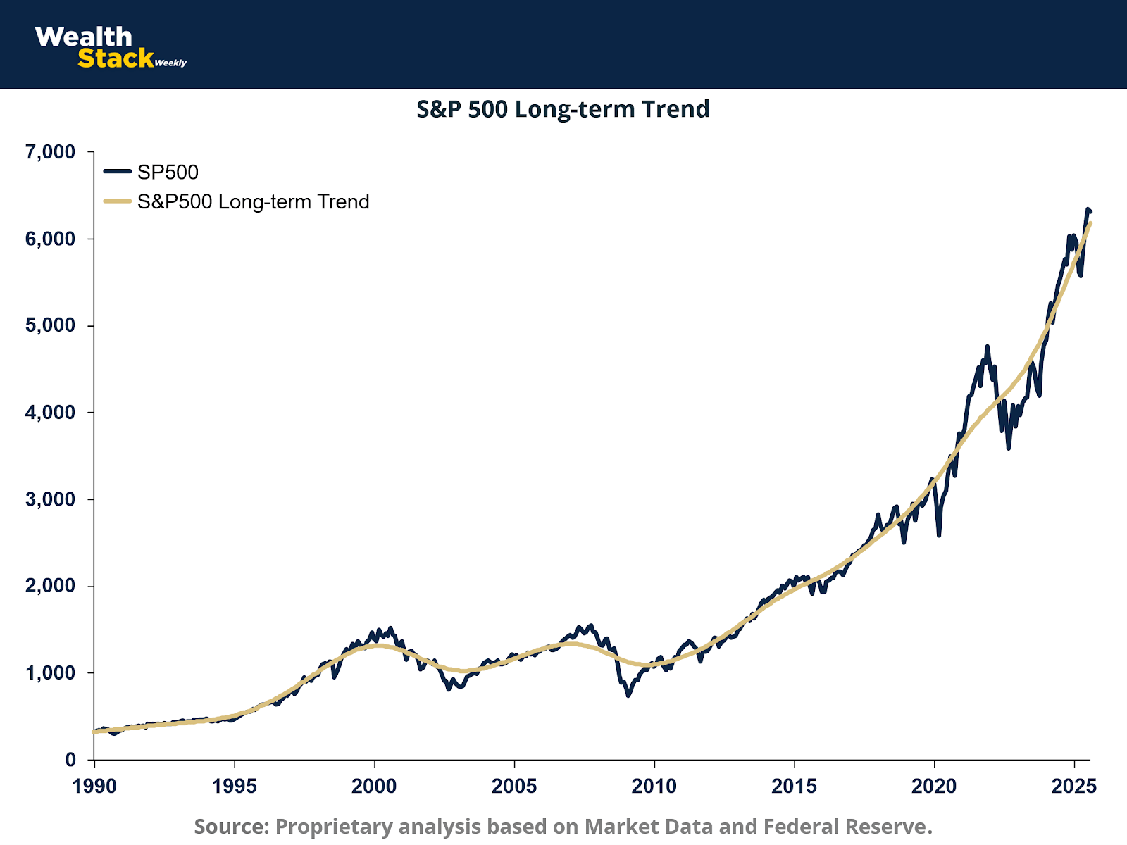 The S&P 500’s long-term trend remains the spine of U.S. equity valuation. Yet beneath that smooth trajectory lies a widening gap between price and productivity.