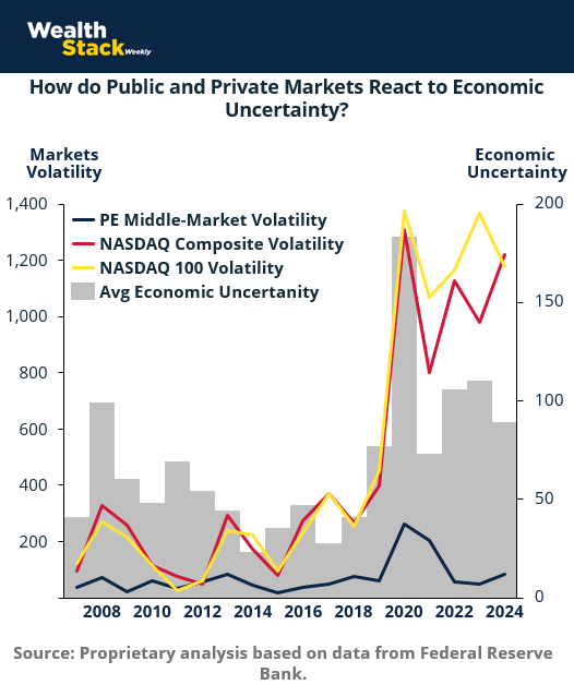 Private markets are calmer, cooler. They move differently. Middle-market private equity shows far less volatility across periods of stress, including 2008 and 2020. Assets aren’t repriced daily. Progress is measured in operating results, not headline reactions or Wall Street plays. Capital stays focused on execution.