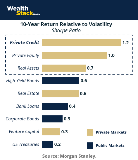 Private credit and private equity have historically delivered higher Sharpe ratios by design. Assets are held through full cycles. Pricing follows operating results rather than daily sentiment. Capital compounds with fewer forced decisions along the way. You’ll notice VC’s spot on the list – it’s volatility is precisely why it’s not an asset class we cover often. At Wealth Stack Weekly, we favor downside risk protection.