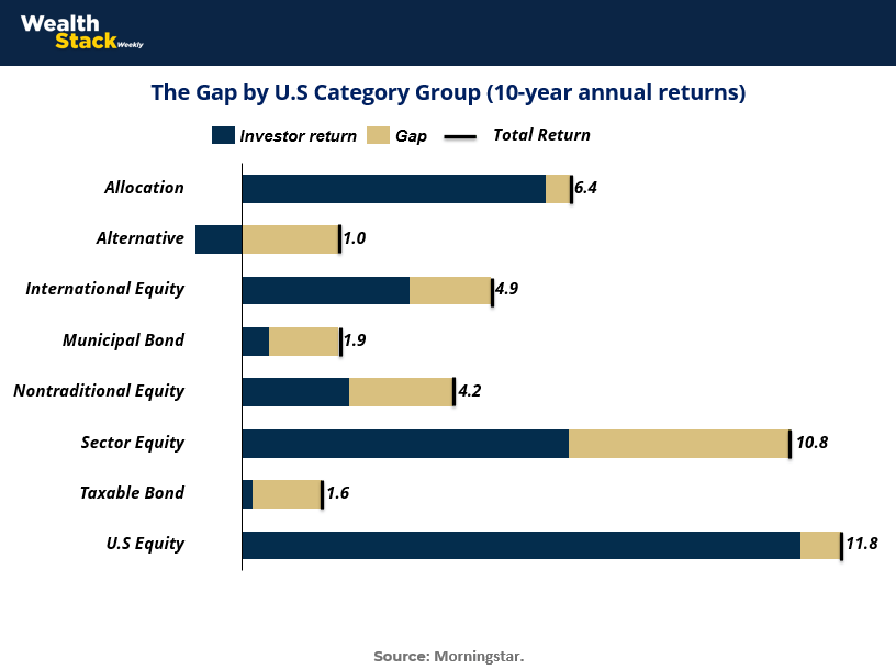 The chart below shows how the gap manifests across major asset categories. In U.S. equity, for example, funds generated average annual returns of 11.8% over a 10-year horizon, but investors captured less due to poor timing decisions.