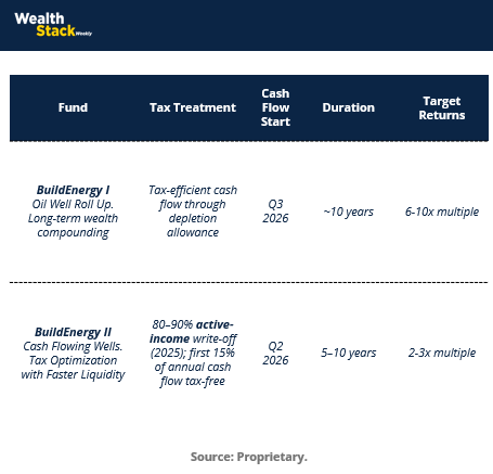 BuildEnergy I and BuildEnergy II were designed to give investors two distinct paths—one built for long-term compounding, the other built for immediate tax relief and cash flow—while tapping into the same macro thesis.