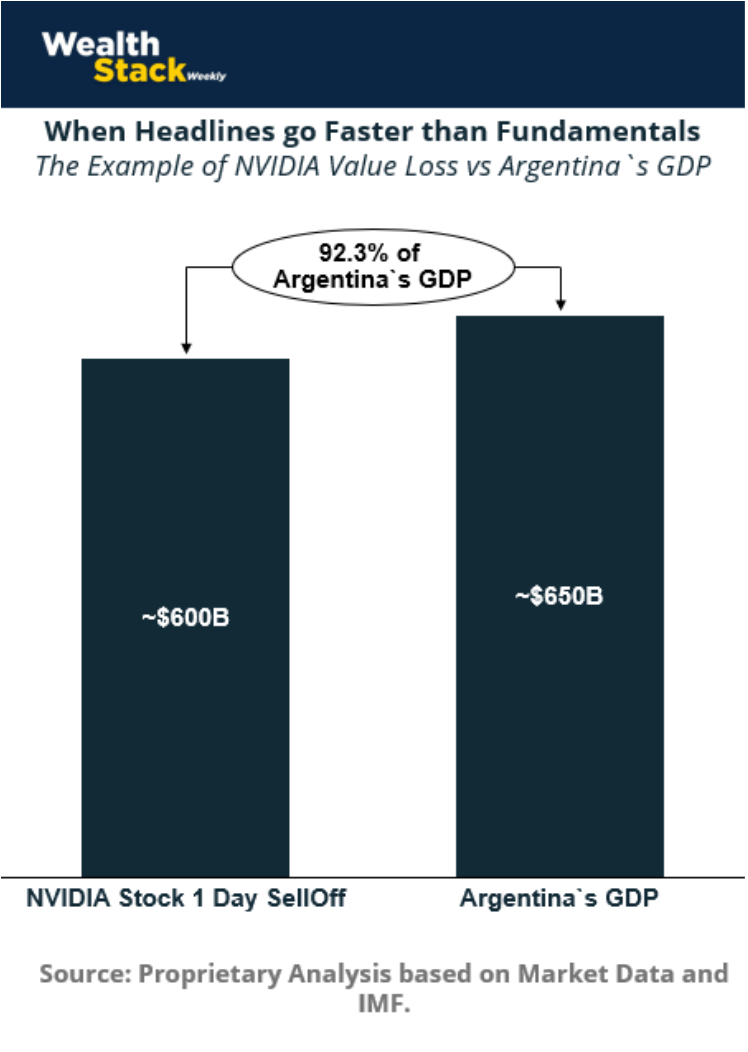 In late January 2025, headlines around DeepSeek — a Chinese AI startup claiming a cheaper, more efficient model — triggered one of the largest single-day repricings in market history. Nvidia fell roughly 17% in one session, erasing nearly $600 billion in market value.