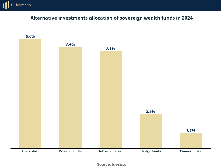When it comes to patient, globally diversified, and strategically positioned capital, few players set the tone like sovereign wealth funds (SWFs). With multigenerational time horizons and deep capital reserves, these funds serve as some of the most sophisticated allocators in the world. This chart reveals a telling breakdown of where SWFs are deploying their alternative investment capital in 2024—and the message is clear: they’re concentrating heavily in real assets and private markets. Real estate (8.0%), private equity (7.4%), and infrastructure (7.1%) lead the pack, far outpacing allocations to hedge funds and commodities.