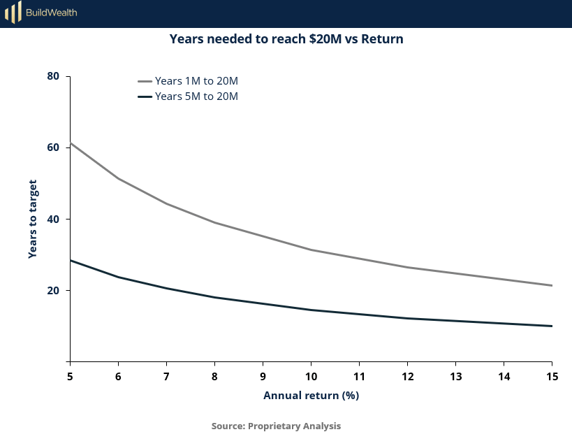 This chart tells a sobering truth: relying solely on public market returns won’t be enough to reach outsized wealth goals within a lifetime. Even with disciplined compounding, moving from $1 million to $20 million in the stock market is a multi-decade journey—often longer than the horizon most people have left to invest.