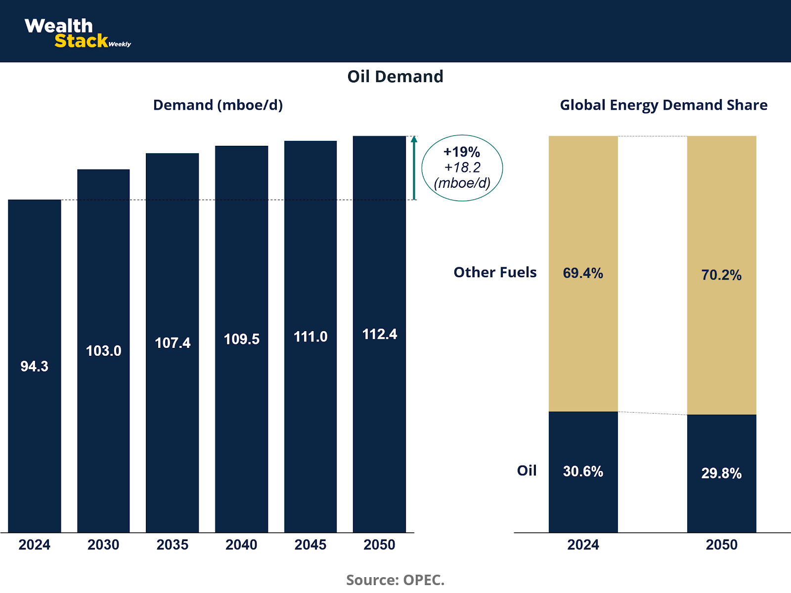 Between 2024 and 2050, total oil demand is projected to rise from 94.3 to 112.4 million barrels of oil equivalent per day (mboe/d), a 19% increase. Even as renewables gain share, oil retains nearly 30% of the world’s energy mix, underscoring its enduring strategic relevance.