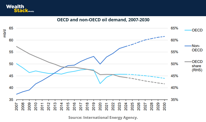 A defining feature of this next cycle is the structural divergence between OECD and non-OECD demand. Developed economies are entering a plateau phase, while non-OECD markets—especially in Asia, Africa, and the Middle East—drive global consumption growth. This divergence reinforces the investment thesis that the world’s energy infrastructure, production, and logistics will continue to rely on hydrocarbons as the backbone of industrial growth.