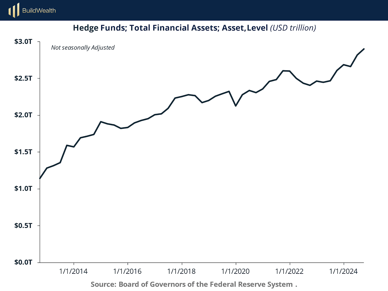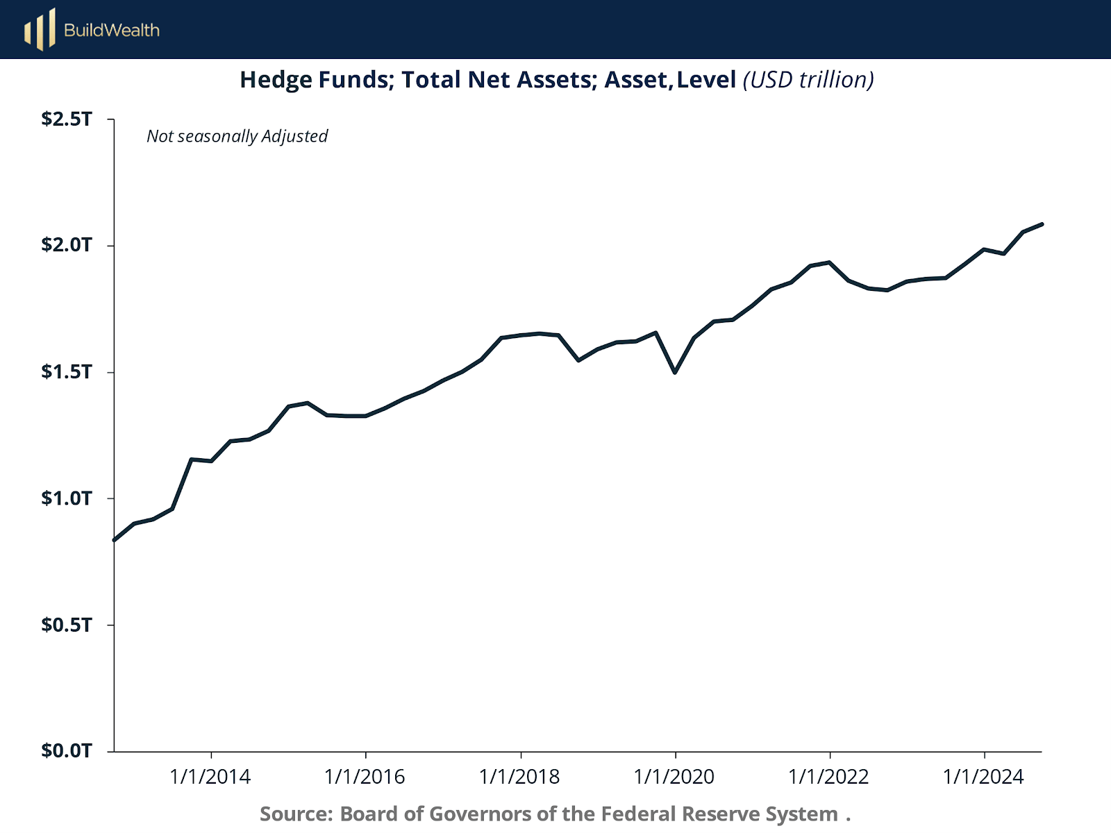 These structural differences are evident in the asset base. Hedge fund assets have climbed steadily since 2014, nearing $2.2 trillion in net assets. Much of this has gone to quant-driven and multi-strategy funds.
