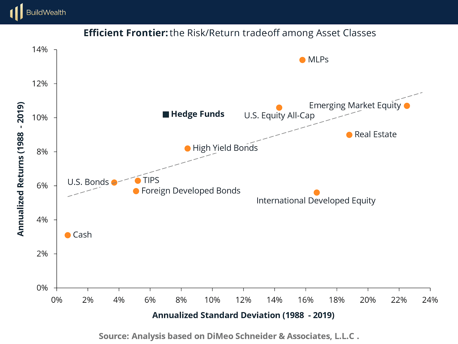 In a long-term context (1988–2019), hedge funds provide a compelling balance of return and volatility. They outperform fixed income instruments and approach equity-level returns, with notably lower standard deviation. This is why institutions use hedge funds as a portfolio diversifier, not just a return enhancer.