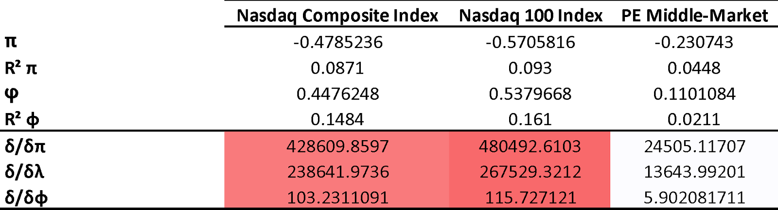 The regression evidence reinforces this point. Public equities exhibit strong negative sensitivity to interest rate changes, with the NASDAQ Composite showing a sensitivity of -0.4785 and the NASDAQ 100 even higher at -0.5706. These assets behave like long-duration instruments, violently repricing as discount rates move. Private equity middle-market transactions, on the other hand, show a far milder sensitivity of -0.2307.