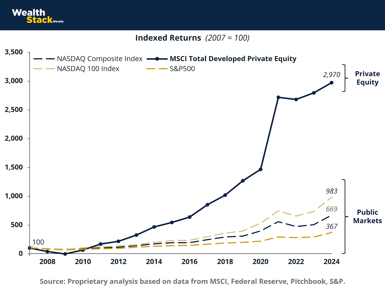 From a base of 100 in 2007, MSCI Total Developed Private Equity grew to 2,970 by 2024. Over the same period, the NASDAQ 100 reached 983, and the S&P 500 just 267. This is not a short-term anomaly. It is a long-cycle compounding effect.