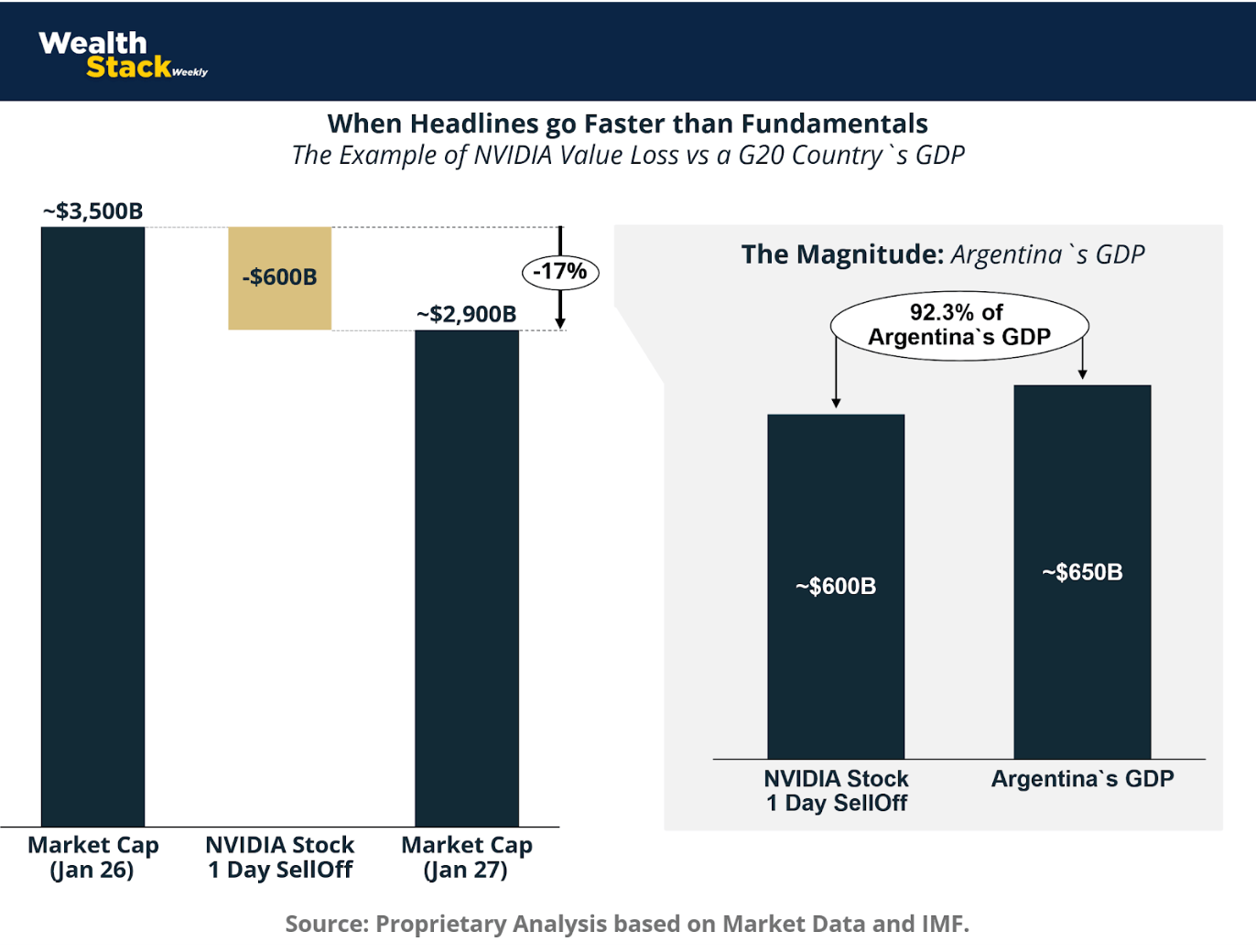 To put that number into perspective, USD 600 billion is not an abstract figure. It is almost the entire annual GDP of Argentina, a G20 economy with roughly USD 650 billion in yearly economic output. In other words, in a matter of hours, markets repriced Nvidia by an amount comparable to what Argentina produces in goods and services over an entire year.