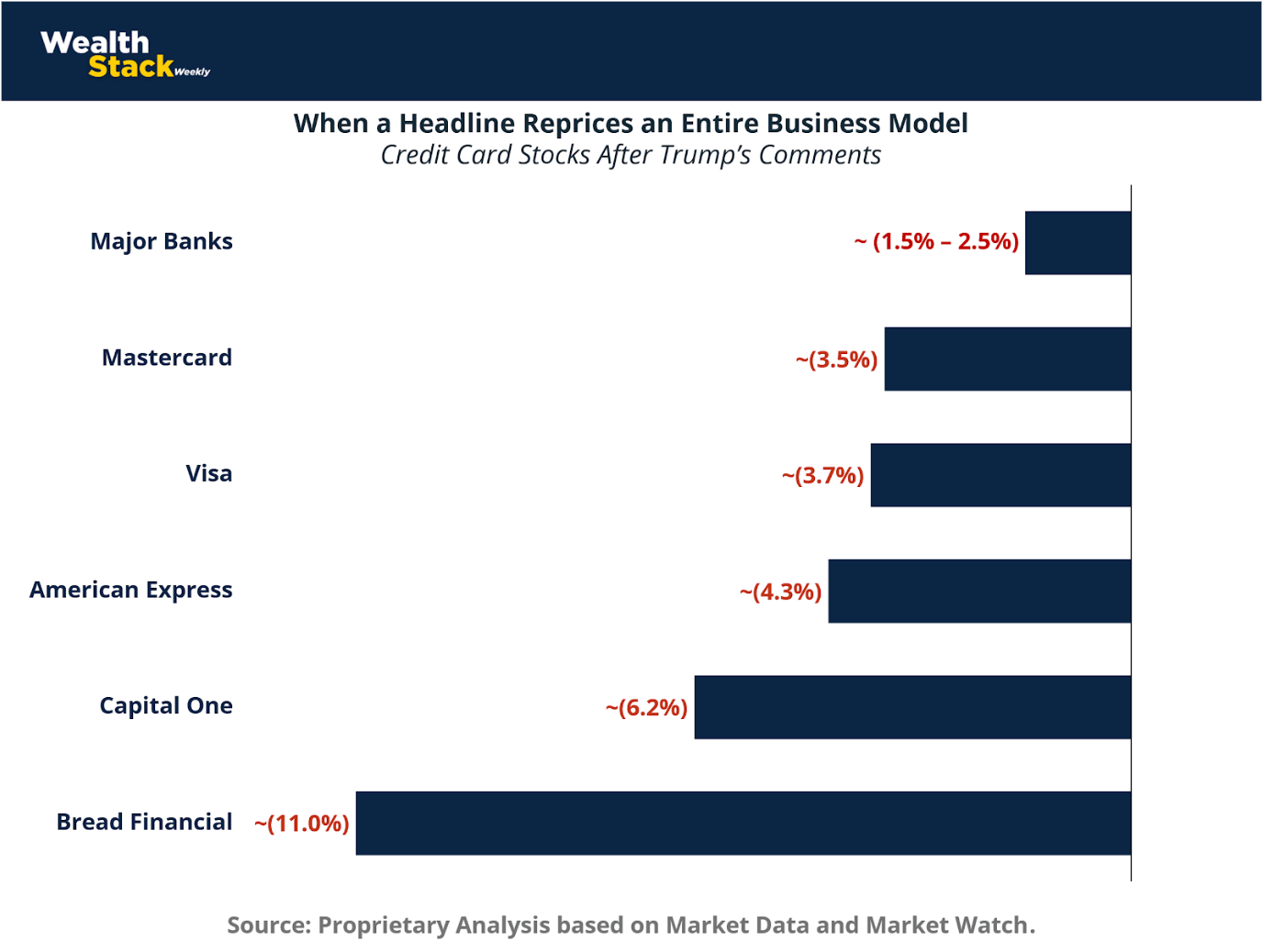 The credit card sell-off is therefore not a story about regulation. It is a story about how quickly markets convert political language into economic outcomes, often collapsing years of uncertainty into a single trading session. The chart makes this clear: billions of dollars in market value were reallocated based on words, not laws.