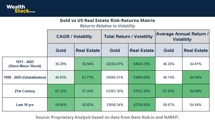 Risk-adjusted outcomes reinforce this conclusion. Across multiple periods—from globalization to the 21st century to the last decade—real estate consistently delivers higher returns per unit of volatility than gold. Gold’s higher volatility reflects its dependence on macro narratives and investor psychology. Real estate’s superior risk-adjusted profile reflects contractual cash flows, embedded pricing power, and balance-sheet asymmetry created by fixed-rate debt.