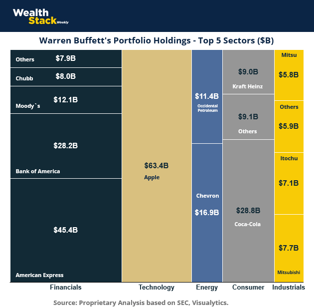 Even Berkshire Hathaway’s $287.2 billion portfolio remains unapologetically concentrated (as of May 2025). One glance at the Visualytiks sector chart tells the story: across his top 5 sectors over 91.42% of Buffett’s capital is tied up in just 12 holdings: Financials, Technology, Consumer Staples, and Energy.